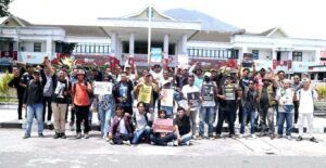TERNATE — Koalisi Jurnalis Maluku Utara yang terdiri dari AJI Ternate, LBH Marimoi, LPM Aspirasi, LPM Mantra, IJTI, AMSI, Pelita, SIEJ, Pers Hukrim, dan PWI Ternate menggelar aksi solidaritas di depan Kantor Wali Kota Ternate, Selasa (4/11/2025).