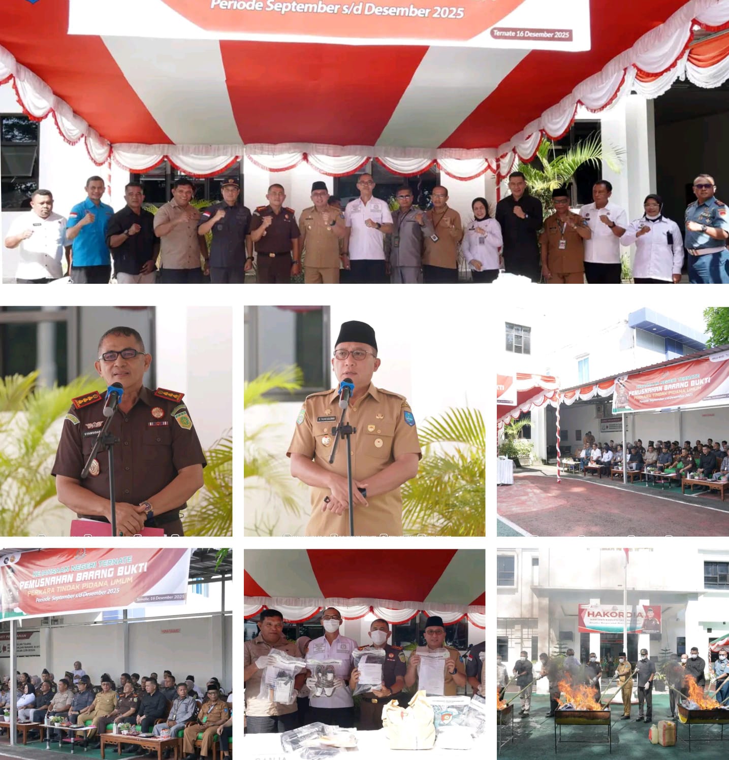 TERNATE — Wali Kota Ternate, Dr. H. M. Tauhid Soleman, M.Si, bersama Kepala Kejaksaan Negeri (Kajari) Ternate Syamsidar Monoarfa, SH., MH, serta jajaran Forum Koordinasi Pimpinan Daerah (Forkopimda) Kota Ternate, menghadiri sekaligus menyaksikan pemusnahan barang bukti perkara tindak pidana umum periode September hingga Desember 2025. Kegiatan tersebut berlangsung di Halaman Kantor Kejaksaan Negeri Ternate, Kelurahan Kalumpang, Kecamatan Ternate Tengah, Selasa (16/12/2025).
