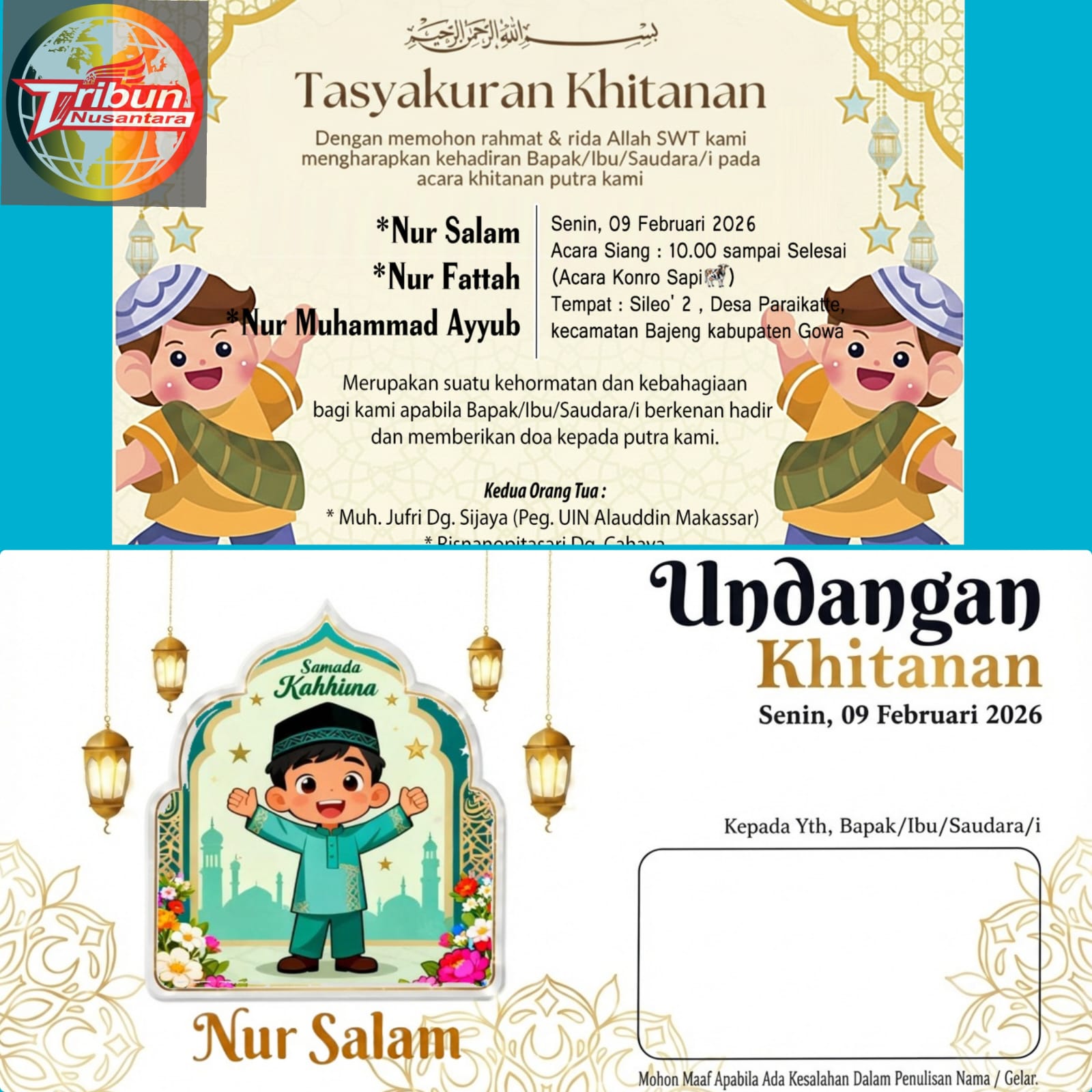 Suasana kebersamaan dan nilai kekeluargaan akan terasa kental dalam pelaksanaan Tasyakuran Khitanan yang digelar oleh Keluarga Besar Muh. Jufri Dg. Sijaya, Pegawai Universitas Islam Negeri (UIN) Alauddin Makassar, bersama sang istri Risnanopitasari Dg. Cahaya. Kegiatan ini dijadwalkan berlangsung pada Senin, 09 Februari 2026, mulai pukul 09.00 WITA hingga selesai, bertempat di kediaman keluarga di Dusun Sileo’ 2, Kecamatan Bajeng, Kabupaten Gowa.